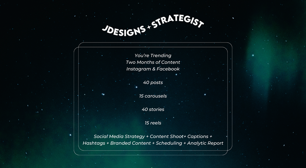 Step up your social media game with our "You're Trending" package, tailored for Instagram and Facebook. Enjoy 40 posts, 15 carousels, 40 stories, and 15 reels meticulously crafted to enhance your brand presence. Our comprehensive service includes strategic social media strategy, engaging captions, optimized hashtags, custom graphics, and precise scheduling. Elevate your online presence and captivate your audience with our expertly curated content and management solutions. Additionally, benefit from targeted analysis, key messaging refinement, Instagram mock-ups, and clear objectives and KPIs to track your progress effectively.